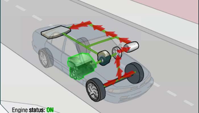 Pada teknologi mobil Hybrid, saat mobil berhenti sebagai contoh pada lampu merah, mesin akan di matikan semua. Energi untuk AC, audio dan peralatan elektronik yang lain pada mobil mengambil daya dari baterai.